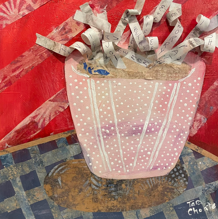 At the Pacific Artists’ Co-Op Gallery, we decided to have a 12″ x 12″ show this month. The idea is that all the artists provide a piece and they are hung side-by-side. It’s an opportunity to see everyone’s stuff together. The piece above is: New Year’s Day at Grandma’s Kitchen Table. Grandma used to have those old milk glass mugs, and by the time New Year’s Day rolled around, we’d be packing up to head home. But I’d still get hot chocolate and listen to the adults talk about their resolutions for the new year.